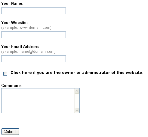 填入网址后点击随后出现的click here,然后填写姓名,网址,email,以及一些意见等,随后提交: