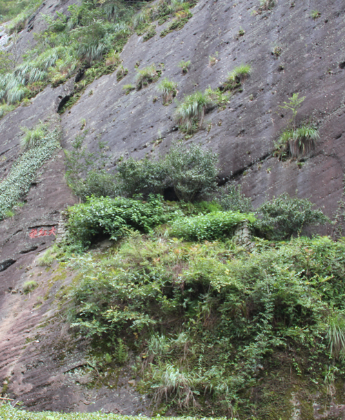 图片1:6棵充满传奇色彩的大红袍母树,都生长在这里的峭壁上,300多年的老茶树,只有1米多高。 王厂长向我们介绍大红袍母树及风景区的变迁
