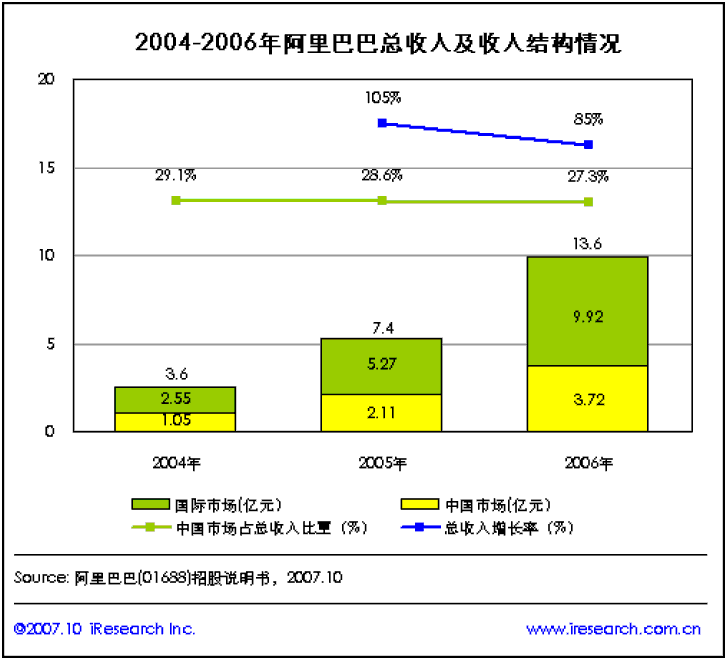 从数据显示,阿里巴巴收入2006年增长85%,达13.6亿元,其中中国交易市场的收入占27.3%。据财报统计数据,2007年上半年,阿里巴巴总收入达9.577亿元,其中国际交易市场6.95亿元,中国交易市场2.61亿元,其他收入0.014亿元,国际交易市场收入占阿里巴巴收入来源70%左右。另外从阿里巴巴的付费会员结构比例中看出中国付费用户的比例均超过85%,2007年上半年国内付费用户比例为87.1%,较2006年同期略有上升。