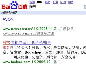 例如在百度检索“雅芳”,雅芳官方网站的百度快照排在竞价排名的网站前面。检索结果如图: