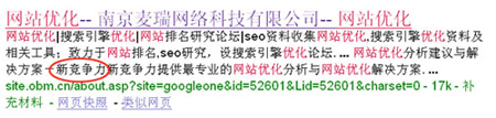 今天无意中在google搜索“网站优化”,结果发现了一件怪事,检索结果中,排在第九位的是一个名为“南京麦瑞网络科技有限公司”网站,网页的摘要很奇怪,截图如下: