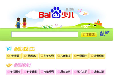 尝试了百度少儿搜索,同普通的百度搜索相比,界面相对活泼,色调亮一点,增加了一些少儿网站导航和少儿知识库以做引导。