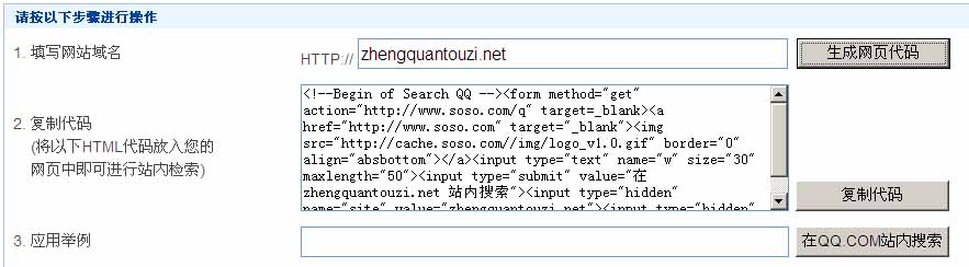第二步,填入网站域名,如zhengquantouzi.net;获取soso生成的站内检索代码。