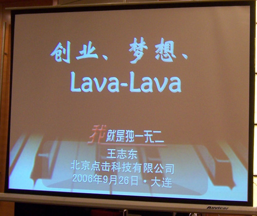 不过,在2006中国百网商联高级峰会上,与会嘉宾对王志东最感兴趣的,可能并不是Lava-Lava,而是王志东的梦想——这是不断被人问到的问题,这或许与王志东的主题演讲内容有关——他演讲的题目是“创业、梦想、Lava-Lava”(图片附后)。王志东说,他从一个投资家那里听到一句印象非常深刻的话希望和大家一起分享:“创业就是用有限的资源实现无限的梦想”。
