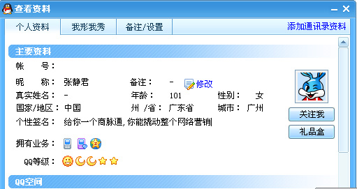 我们看看张静君QQ签名的核心关键词:“商脉通”和“整个网络营销”。