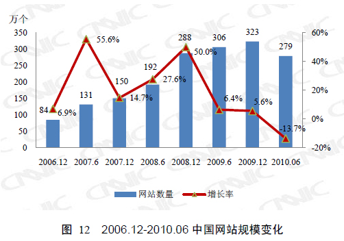 2010年7月15日,中国互联网络信息中心(CNNIC)发布了《第26次中国互联网络发展状况统计报告》(报告摘要附后)。统计数据表明,中国互联网用户数量仍在持续高速增长,到2010年6月30日,上网人数已经达到4.2亿人,手机上网用户达2.77亿人。与此同时,中国的网站数量从2009年12月底的323万个减少到279万个,这也是中国互联网发展史上首次出现域名注册数量及网站数量同时减少,这一数字引起业内很多分析人士的关注。