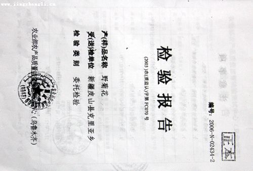 6、克里阳雪菊首次送检时间是2006年,今年由于申请原产地地理保护等需要,第二次送农业部农产品质量监督检验中心检测,最新的雪菊检测报告结果不久就会出来。经过几年时间人工种植和培育,昆仑雪菊的功效和成分会不会有所变化?这是克里阳乡政府人员比较关心的问题,当然也关系到广大消费者的实际利益。等检测结果来说话吧。