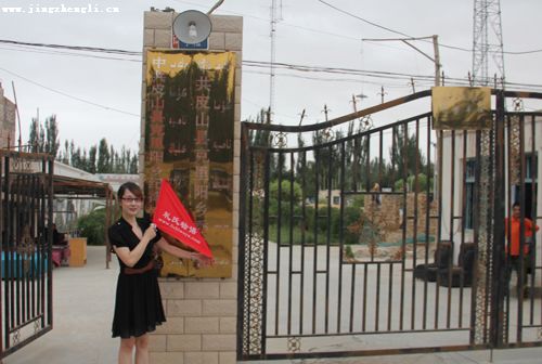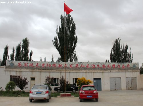 图片6、克里阳乡政府院内的标语,背景图为昆仑雪菊,左侧图标为注册商标图案。