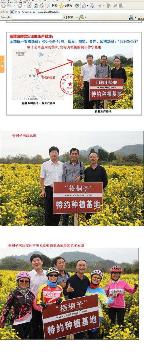 (1)上图为八骏山茶业盗用梧桐子网站在黄山拍摄的图片作为新疆喀喇昆仑山雪菊基地的证明