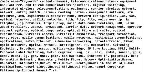 最近在研究走国际化路线的中国企业海外网站,发现这些公司都特重视全球站的建设。华为公司英文网站huawei:http://www.huawei.com总体上就做得很不错,尤其是它清晰的、富于层次感的、重点突出的导航。风格也很欧美化。刚要拍手称赞之际,不料却看到它的meta keywords,吓了一跳: