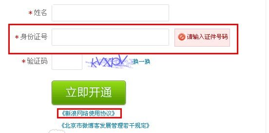 (1)2012年3月16日是部分提供微博客服务的网站实行微博实名注册的时间节点。从2012年3月16日开始,网民在四大门户网站注册微博,均需提供个人真实信息。搜狐、网易、腾讯均通过注册协议中的隐私权政策条款来规范用户信息的真实性(详见参考资料2、3、4),而新浪则直接以身份证信息为注册必填内容来规范用户账号信息(见下图)。