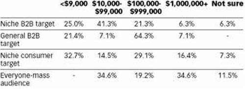 美国市场研究公司MarketingSherpad在一份名为“Online Advertising 2008: What Works, What Doesn't and Why”的报告中指出,虽然利基营销人员的用户定位的仍然很有难度,但至少比大众常规营销节约费用。该报告在2008年2月调查了美国的市场营销人员,结果发现接近3分之1的针对狭缝市场的消费者的营销费用小于9000美元/月,那些面对大众市场的常规营销费用则远高于这个数字,超过3分之1的进行大众市场营销的企业营销费用超过100万美元/月。具体调查数据请看以下表格。
