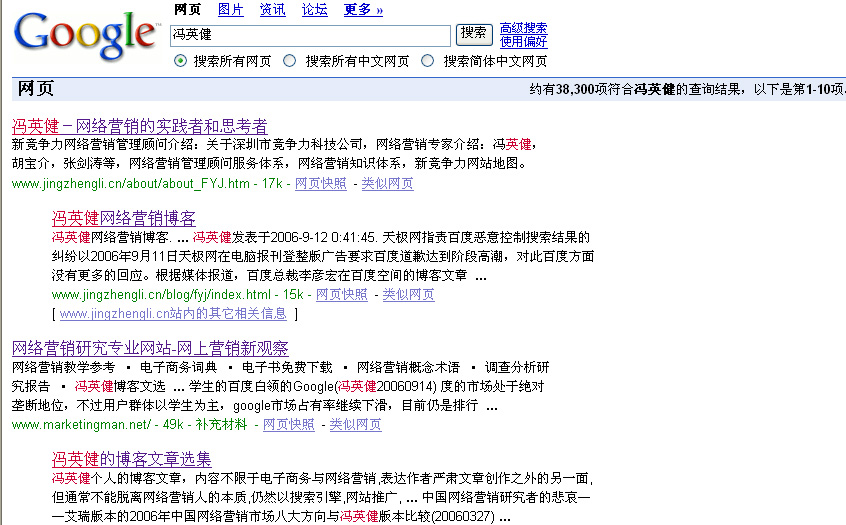立此存照:用google检索“冯英健”的结果页面截屏(2006年10月8日)