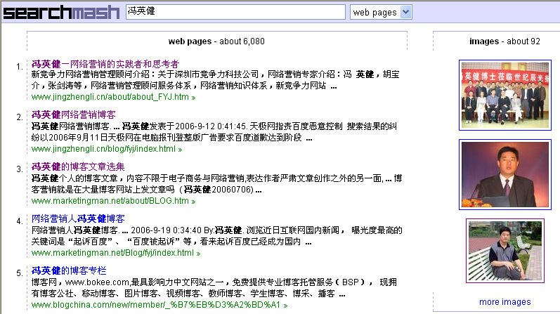 立此存照:用Searchmash检索“冯英健”的结果页面截屏(2006年10月8日)