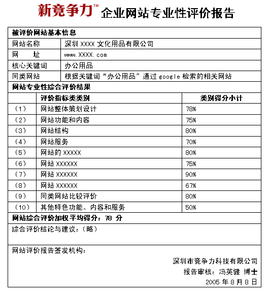 网站专业性评价报告是由新竞争力提供的收费网络营销管理顾问服务项目。本评价报告是对企业网站总体策划、网站结构、网站功能、网站内容、竞争者分析等十类共计120项指标的全面诊断评价,报告内容包括十类指标每项指标得分以及网站总评得分。