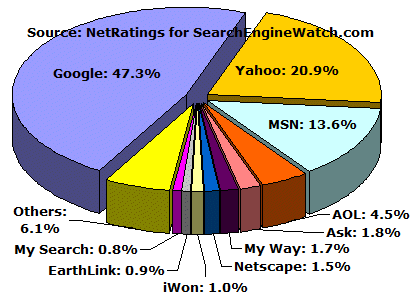 调查:2005年3月美国用户使用各搜索引擎的比例