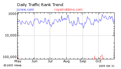 下图分别为jcrew.com和RoyalRobbins.com网站访问量统计曲线,以及两个网站排名曲线的比较。